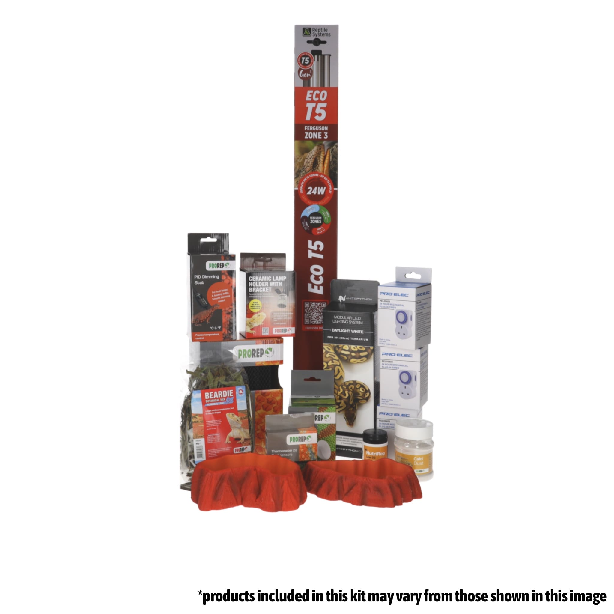 Transform your bearded dragon’s habitat with the ProRep Bearded Dragon Accessory Kit, an all-in-one solution designed specifically for the sophisticated lighting, heating, and nutritional needs of these remarkable reptiles. Bearded dragons require precise UVB exposure, thermal gradients, and balanced nutrition to thrive, and this comprehensive kit provides professional equipment to meet every requirement. From the high-quality T5 Zone 3 UVB lamp to the LED supplemental lighting, dual heat sources with independent timers, and precision thermostats, every component works in concert to replicate the bearded dragon’s natural environment. Our included supplements and botanical food mix ensure your dragon receives optimal nutrition for vibrant coloration, strong bones, and overall wellness. Whether you’re setting up a new enclosure or upgrading an existing one, this accessory kit represents the gold standard in bearded dragon care.